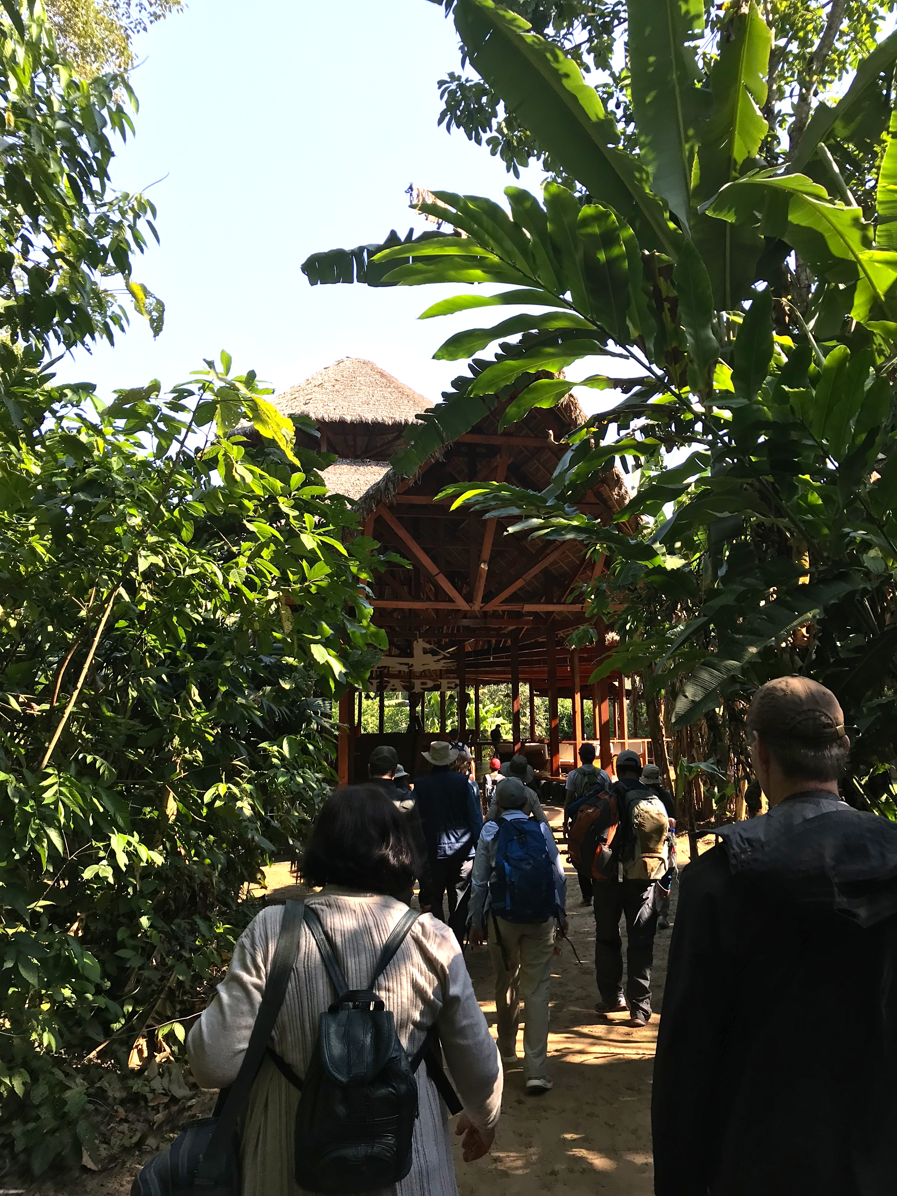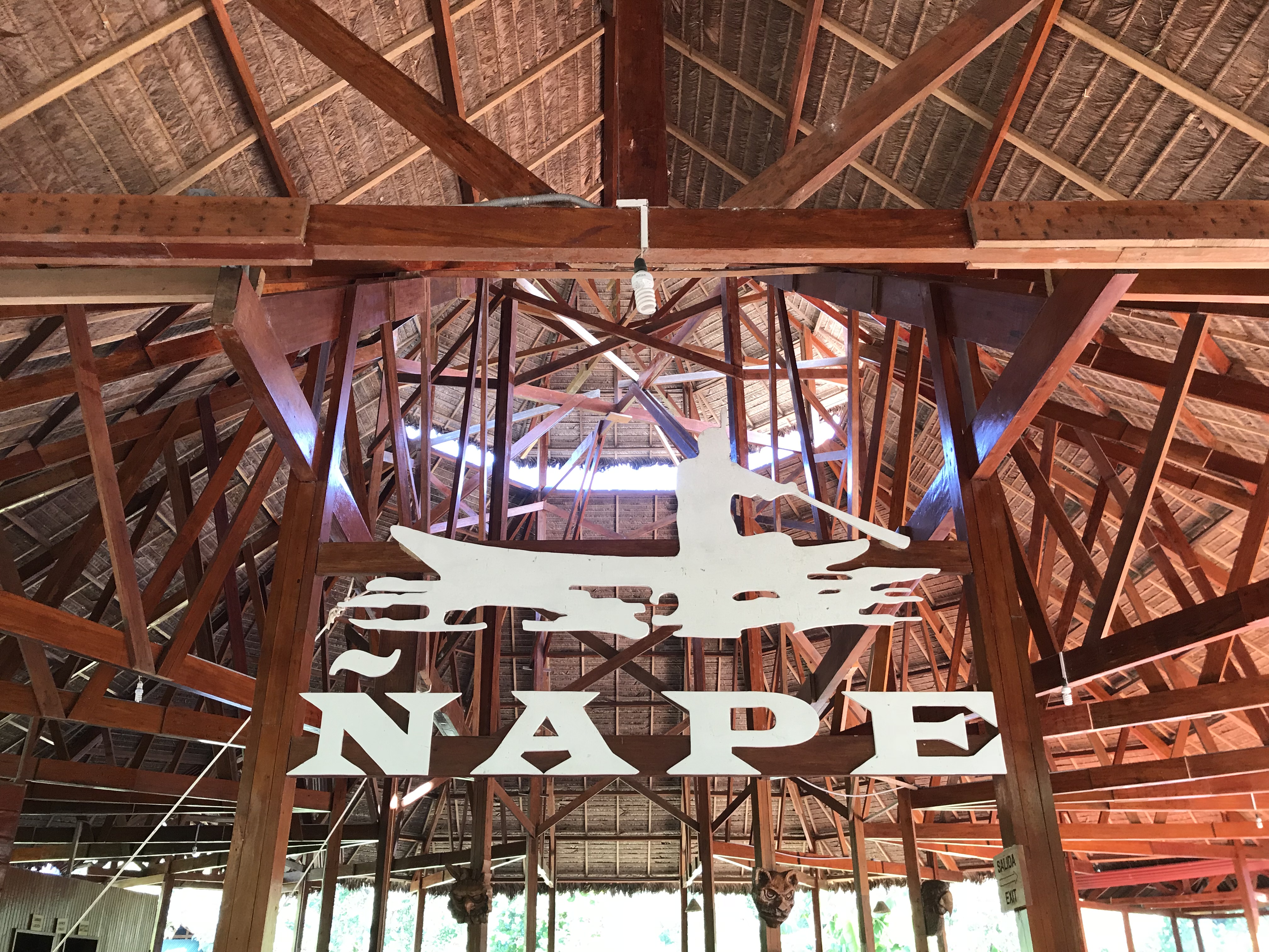 I arrived at NAPE an Eco-conscious Amazon lodge. I was greeted by Shirley, the manager, my guide Ederson, and numerous other people from the Lodge. Each member explained their role and what we would be doing, the rules, and things to be mindful of in the amazon. For instance, minimal electricity, no hot water, no putting toilet paper in the toilet but in the garbage can next to the toilet (that takes some time to get used to), no phone, no WiFi, no Internet, no TV, and all the other modern gadgets we rely on for communication and entertainment. I was thankful its one of the reason I came to Peru was to unplug and listen to my mind and nature. I was given keys to my hut and proceeded down the path to check it out, unpack, and relax before lunch. The hut was unique, crafted from beautiful wood resourced from trees that had fallen in the jungle. It had three walls and a small bathroom, a nice bed with mosquito net, open porch with a roof, and a hammock,