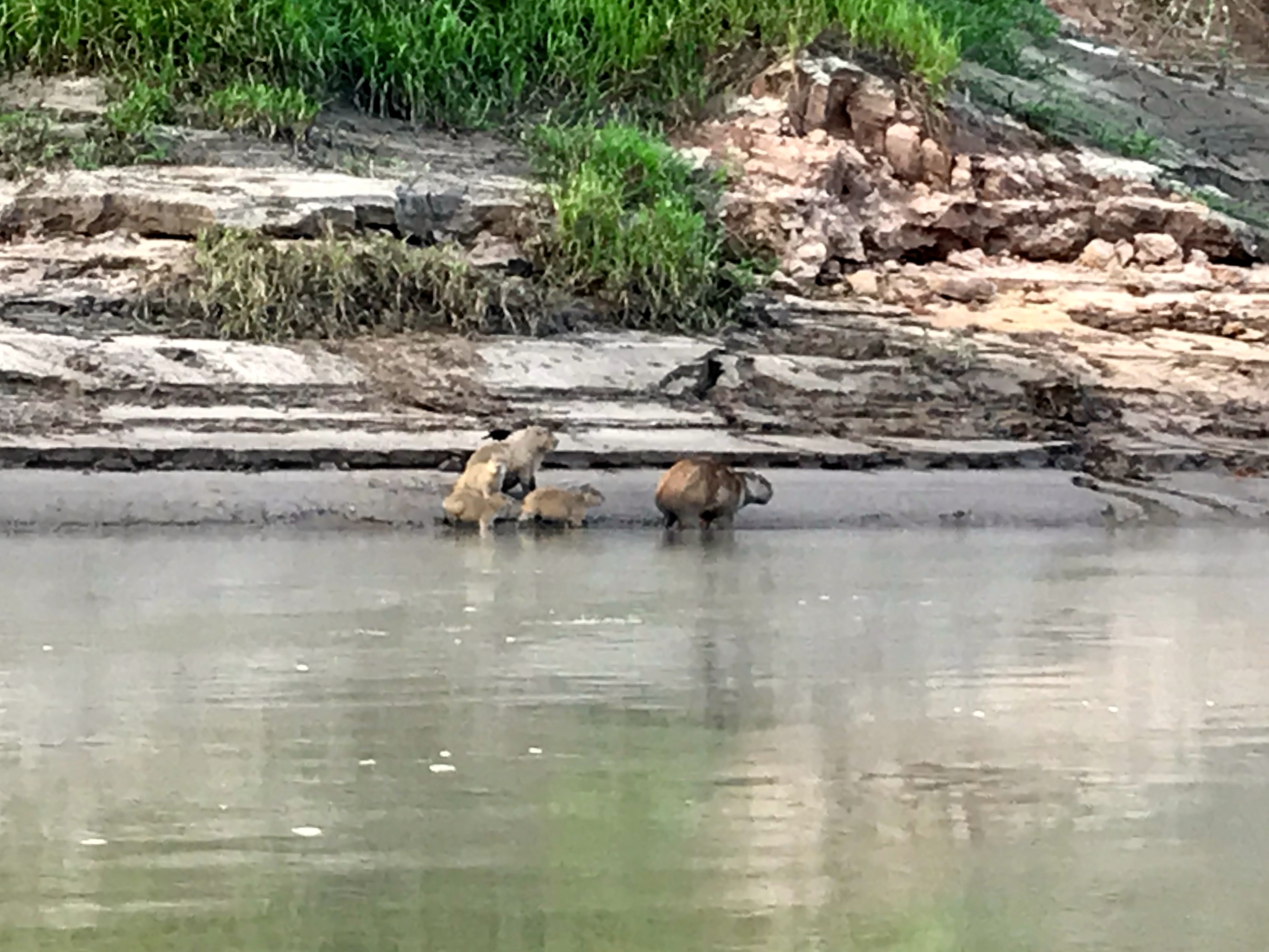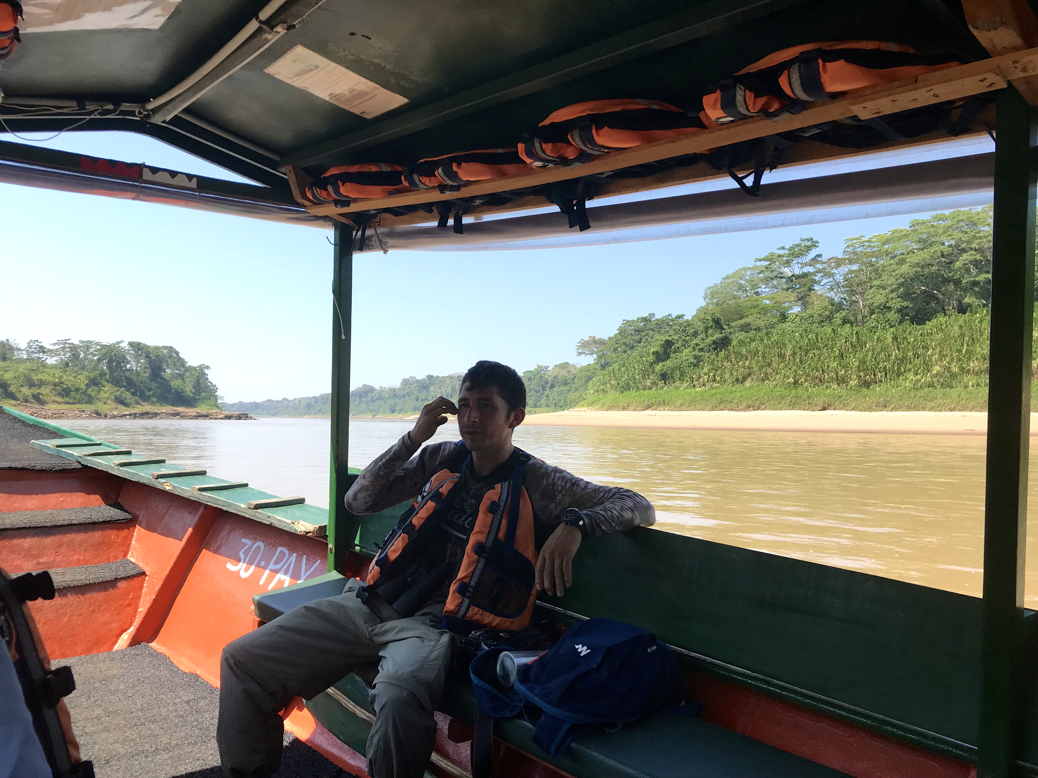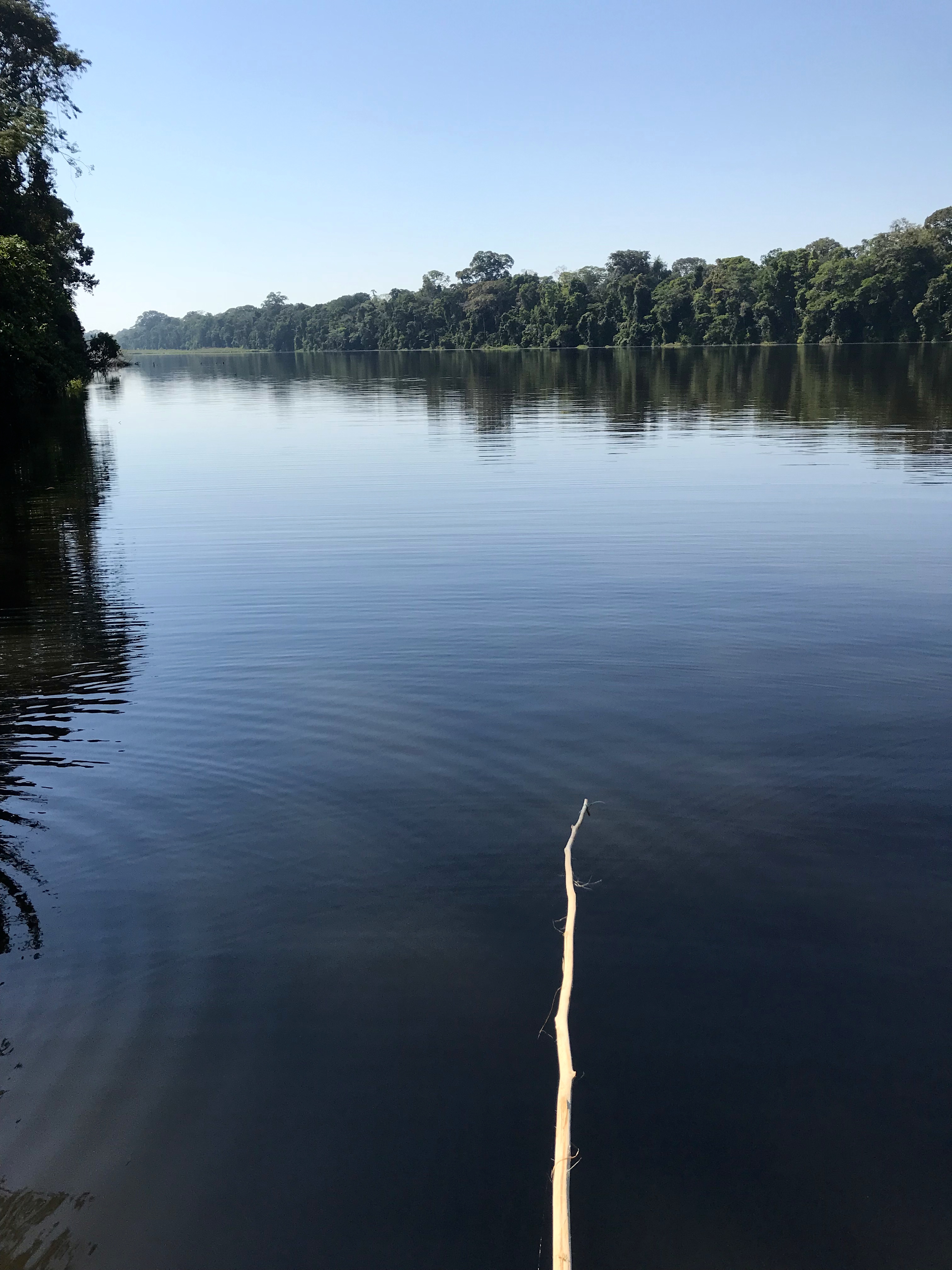 The next morning I got up and headed to breakfast before trekking through the jungle, getting on a boat, and running out onto the Tambopata River. As we motored out, we spotted black Cayman, white Cayman, turtles, Capybara and went to watch Parakeets and Macaws feed on the salt clay. We headed down the river for about an hour before docking and jumping to Tres Chimbadas lake to see wildlife. We trekked through the Amazon for about an hour passing local villages until we reached the lake. We boarded a pontoon boat with no motor because they are not allowed due to a protected family of otters on the lake and other wildlife. We spent about 3 hours on the lake spotting a variety of birds and other wildlife. We also got an opportunity to fish for Piranha, which is challenging. I did not catch any, but Ederson did. We headed back to shore as the sun began to approach full intensity.