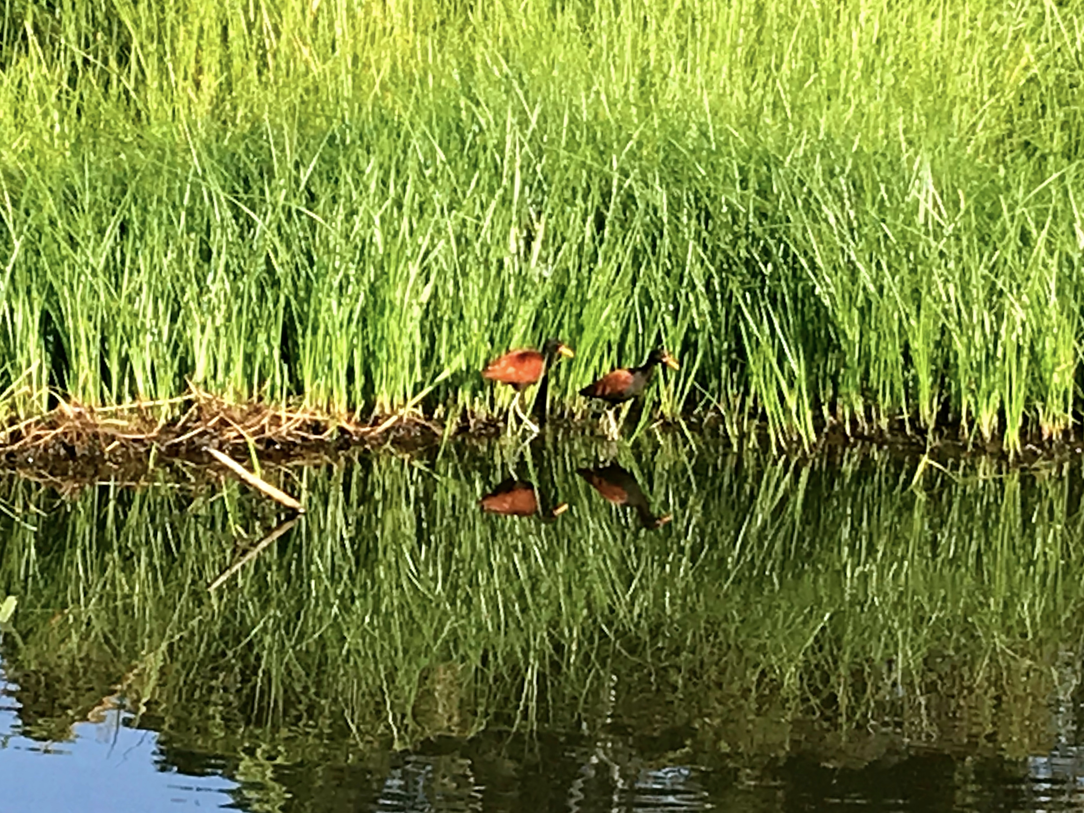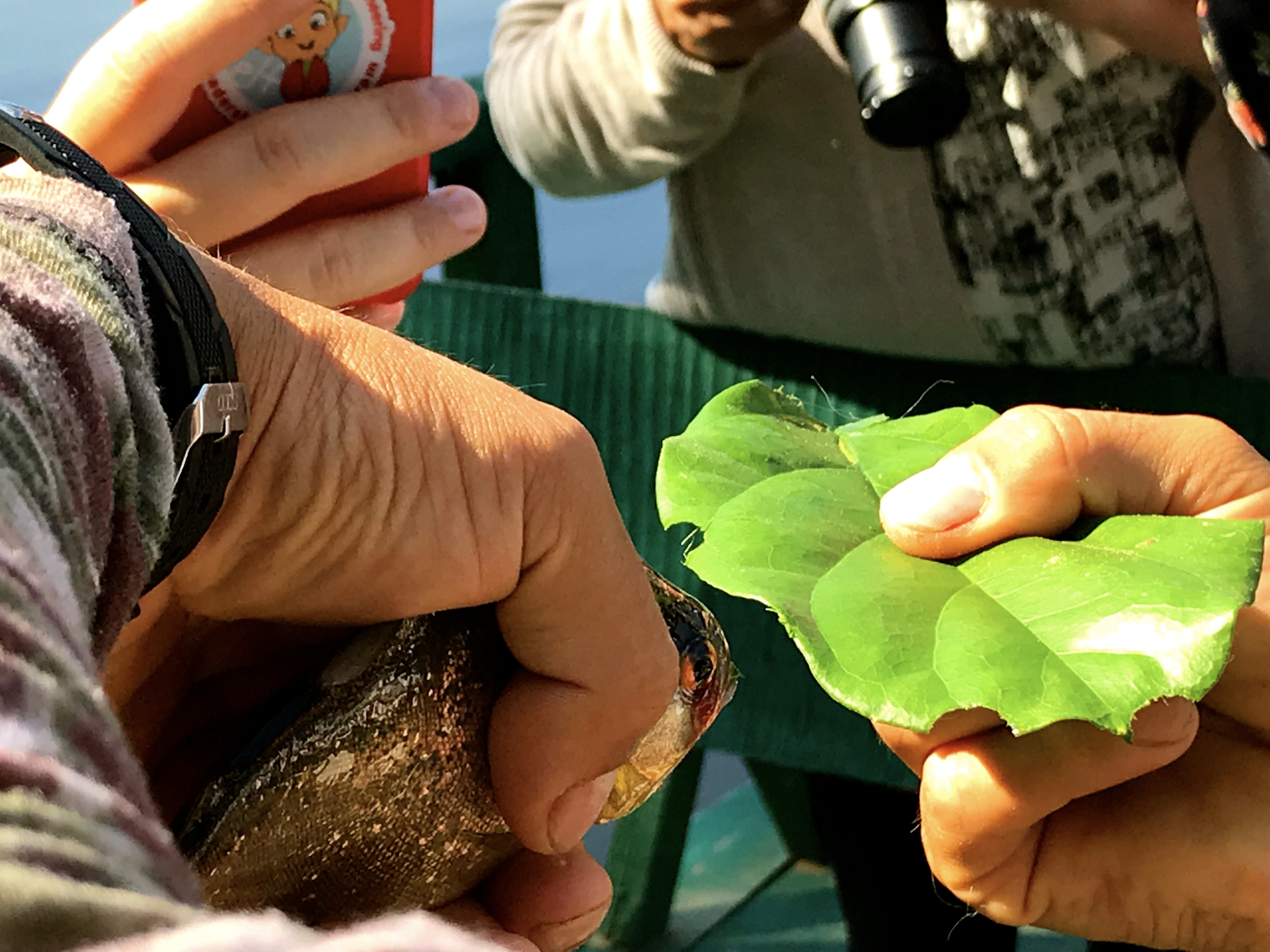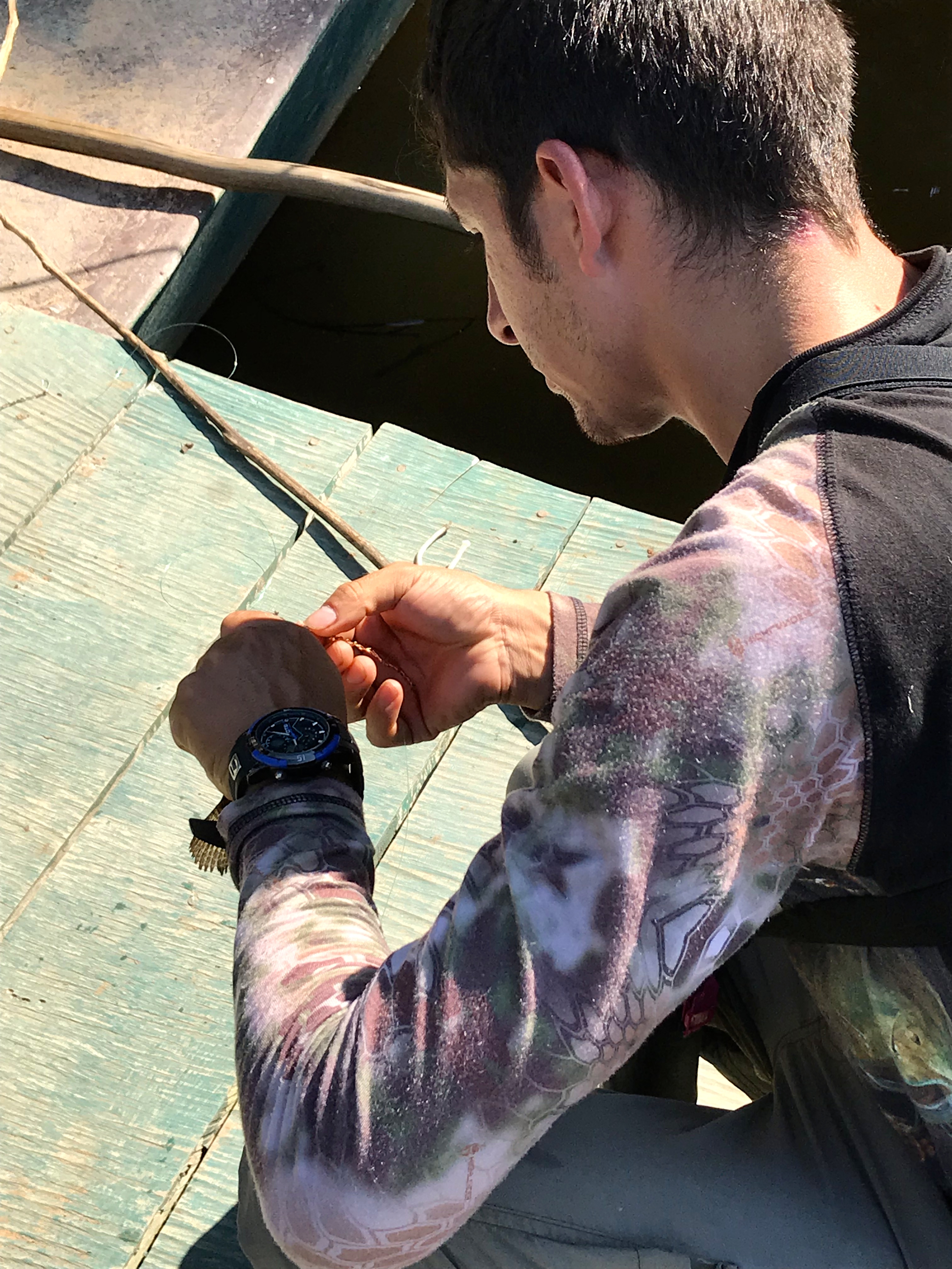 The next morning I got up and headed to breakfast before trekking through the jungle, getting on a boat, and running out onto the Tambopata River. As we motored out, we spotted black Cayman, white Cayman, turtles, Capybara and went to watch Parakeets and Macaws feed on the salt clay. We headed down the river for about an hour before docking and jumping to Tres Chimbadas lake to see wildlife. We trekked through the Amazon for about an hour passing local villages until we reached the lake. We boarded a pontoon boat with no motor because they are not allowed due to a protected family of otters on the lake and other wildlife. We spent about 3 hours on the lake spotting a variety of birds and other wildlife. We also got an opportunity to fish for Piranha, which is challenging. I did not catch any, but Ederson did. We headed back to shore as the sun began to approach full intensity.