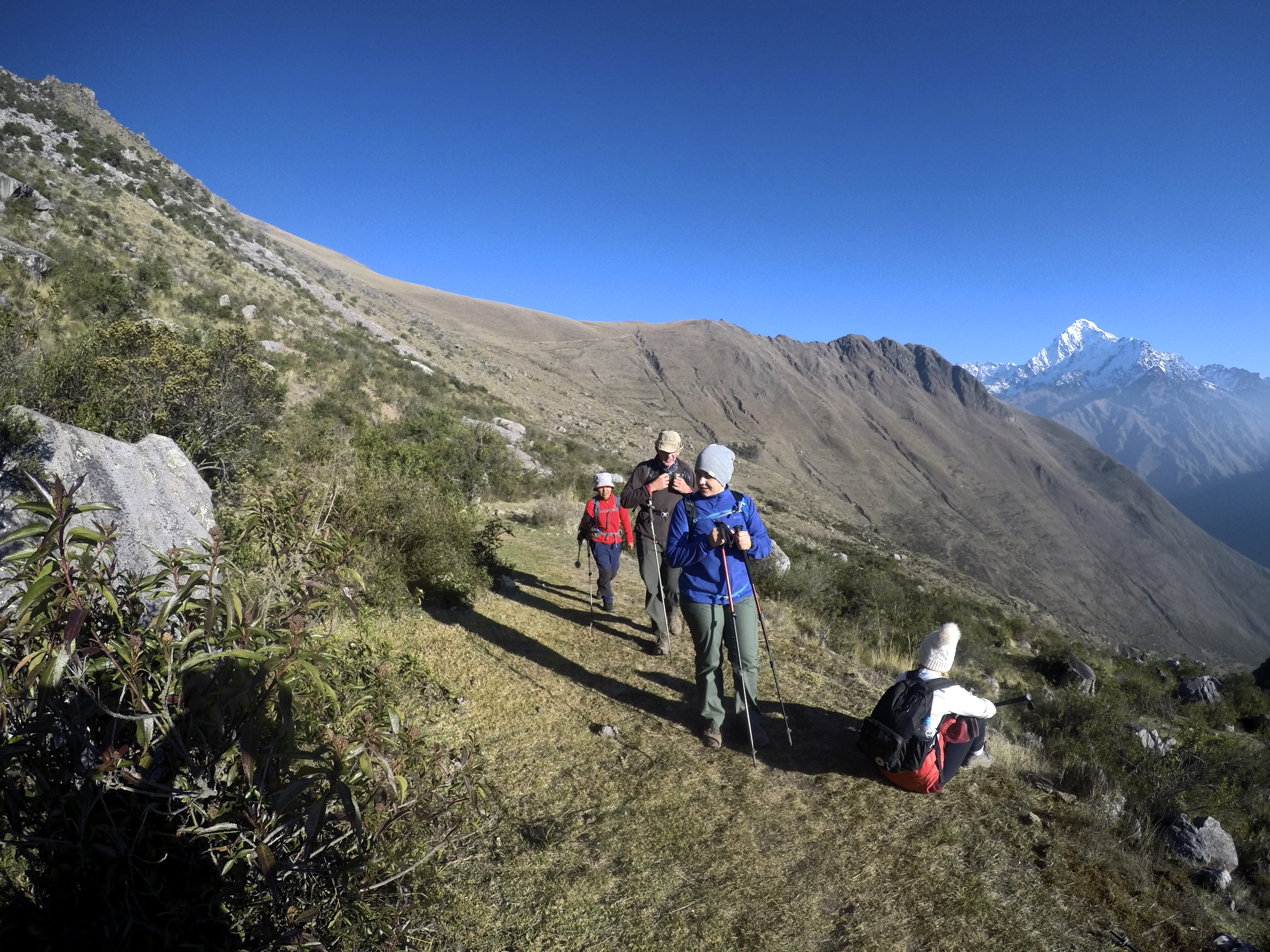 The Sun Gate Inti Punku on the Inca Quarry trail, which in Quechua, means ‘Sun Gate’, and the Incas built structures like these throughout the Andes to honor the sun god. This intriguing archaeological complex overlooks Ollantaytambo and the valley below – which was a fantastic reward on the challenging second day. We all took pictures and then hiked downhill toward the Sacred Valley and base camp for the last night.