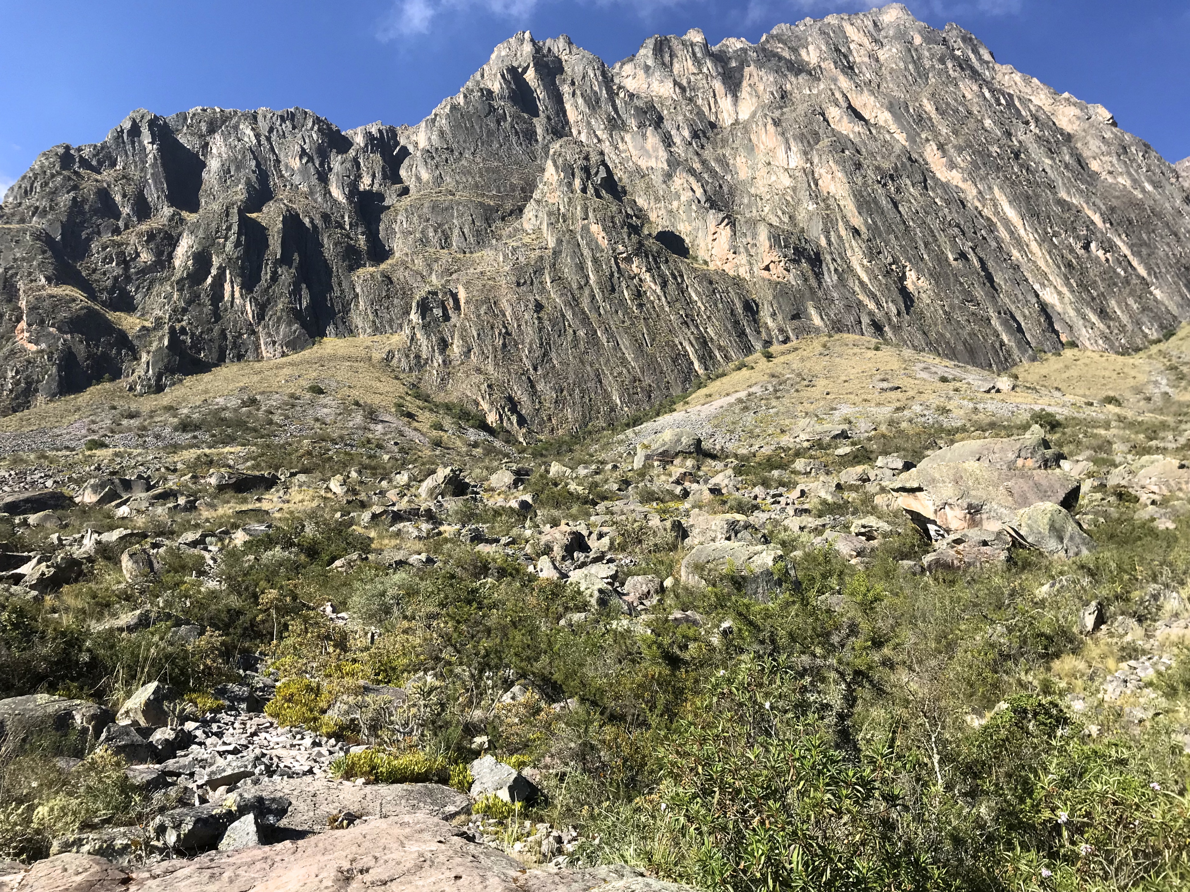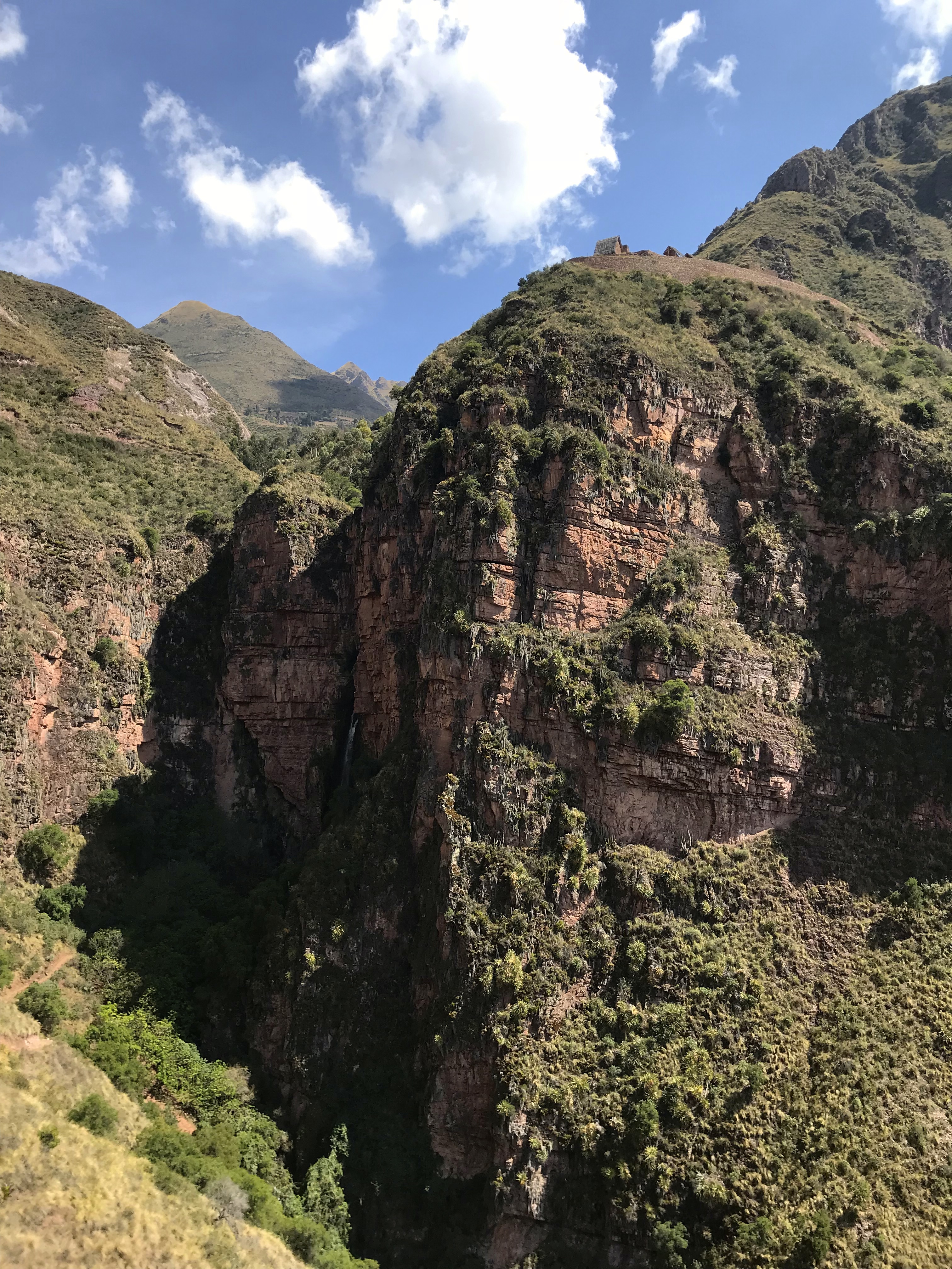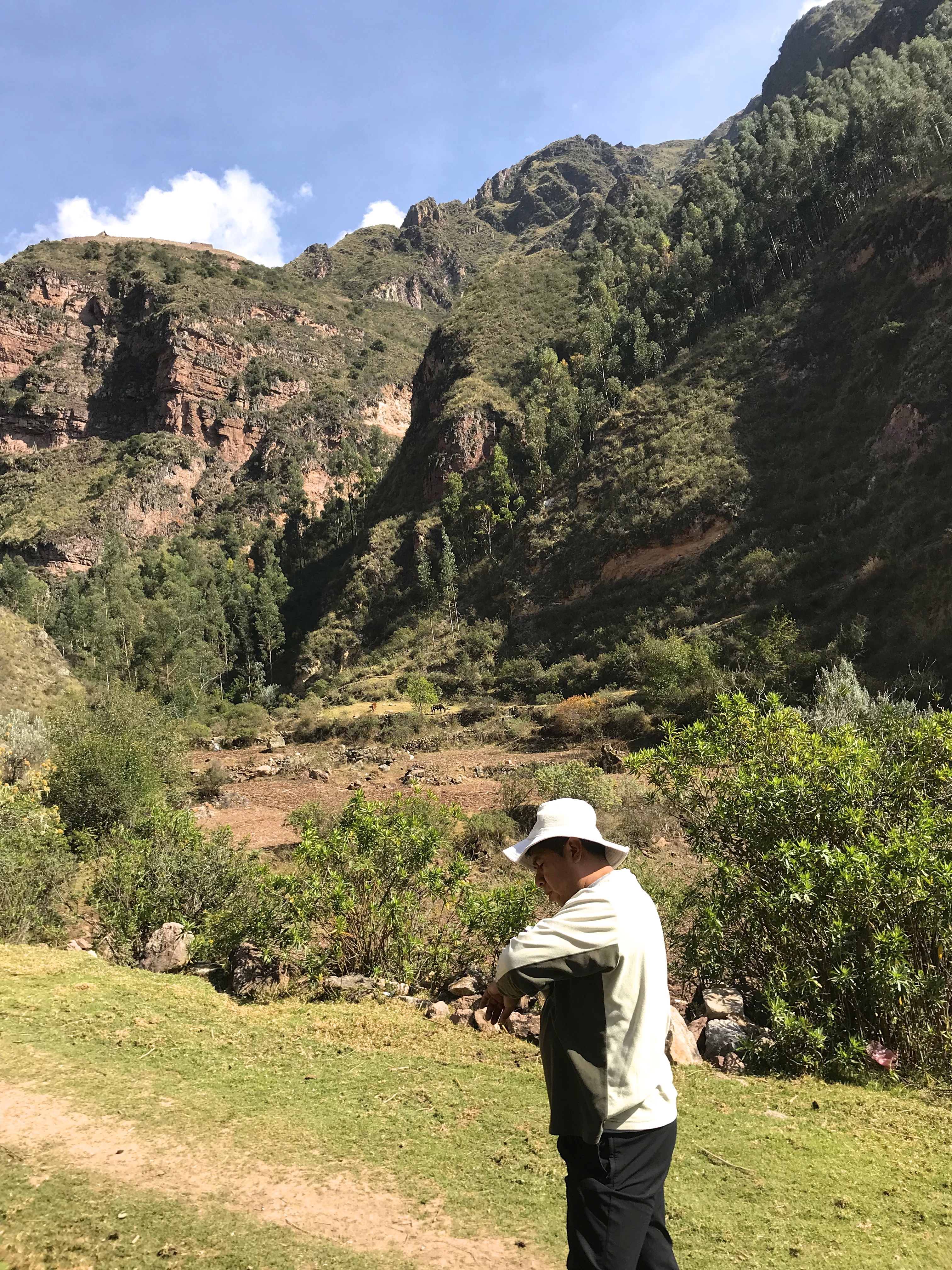 I woke up around the same time and the same routine. Today’s hike would be the easiest of all the days as we hiked through the Sacred Valley down into Ollantaytambo. Since we had descended so much yesterday and would continue today, the weather got warmer, and the oxygen was more available in the air, and my lungs were appreciative. As we continued hiking, Hugo had mentioned to me previously about ancient tombs up into the mountains that were far from the trail, but he would take me when we got to that point if I was interested and had the stamina. Robert and I were game, so we left our bags with the rest of the group, who were gracious enough to wait, and hiked up the side of the quarry mountain to the ancient tombs.