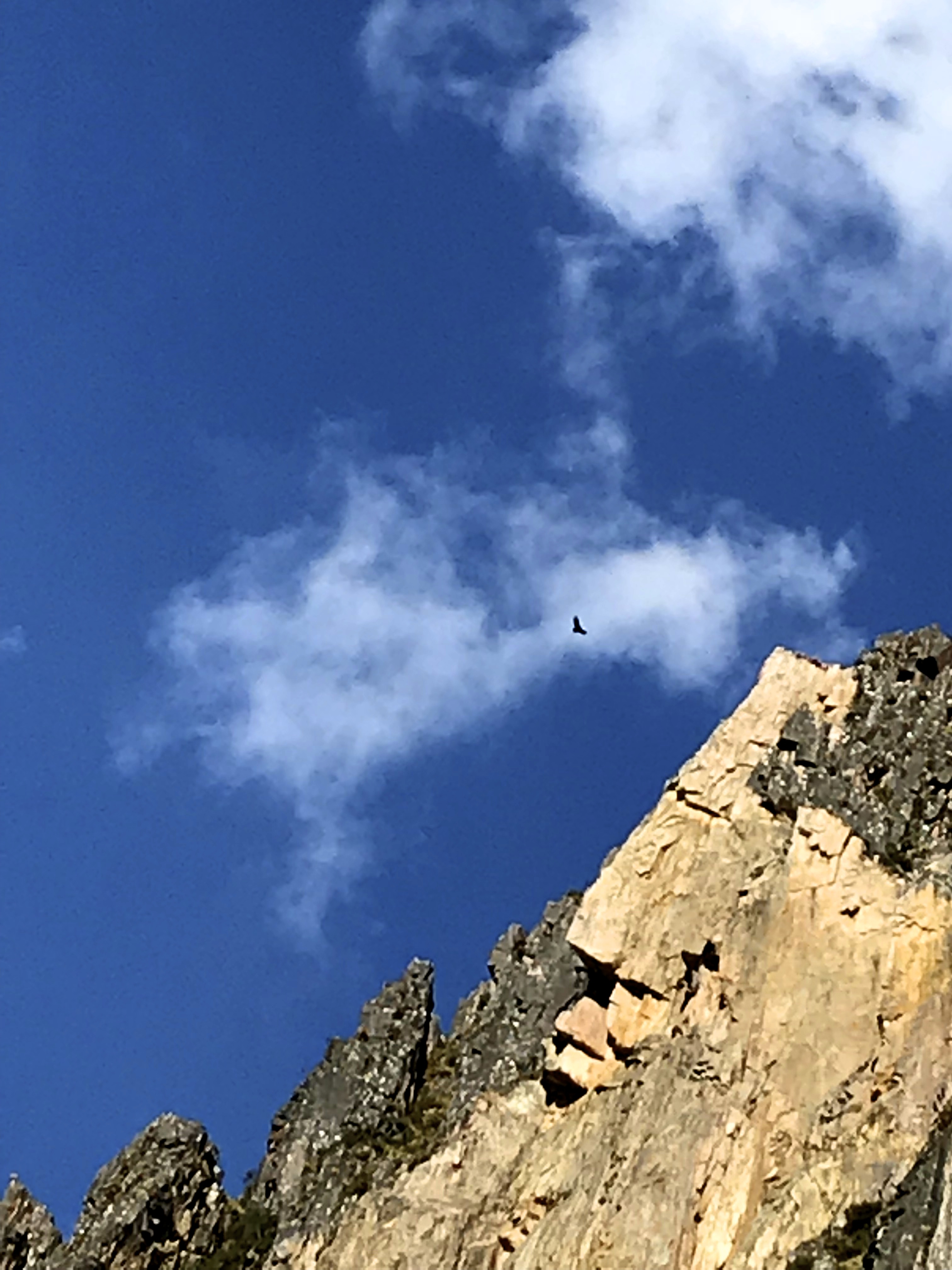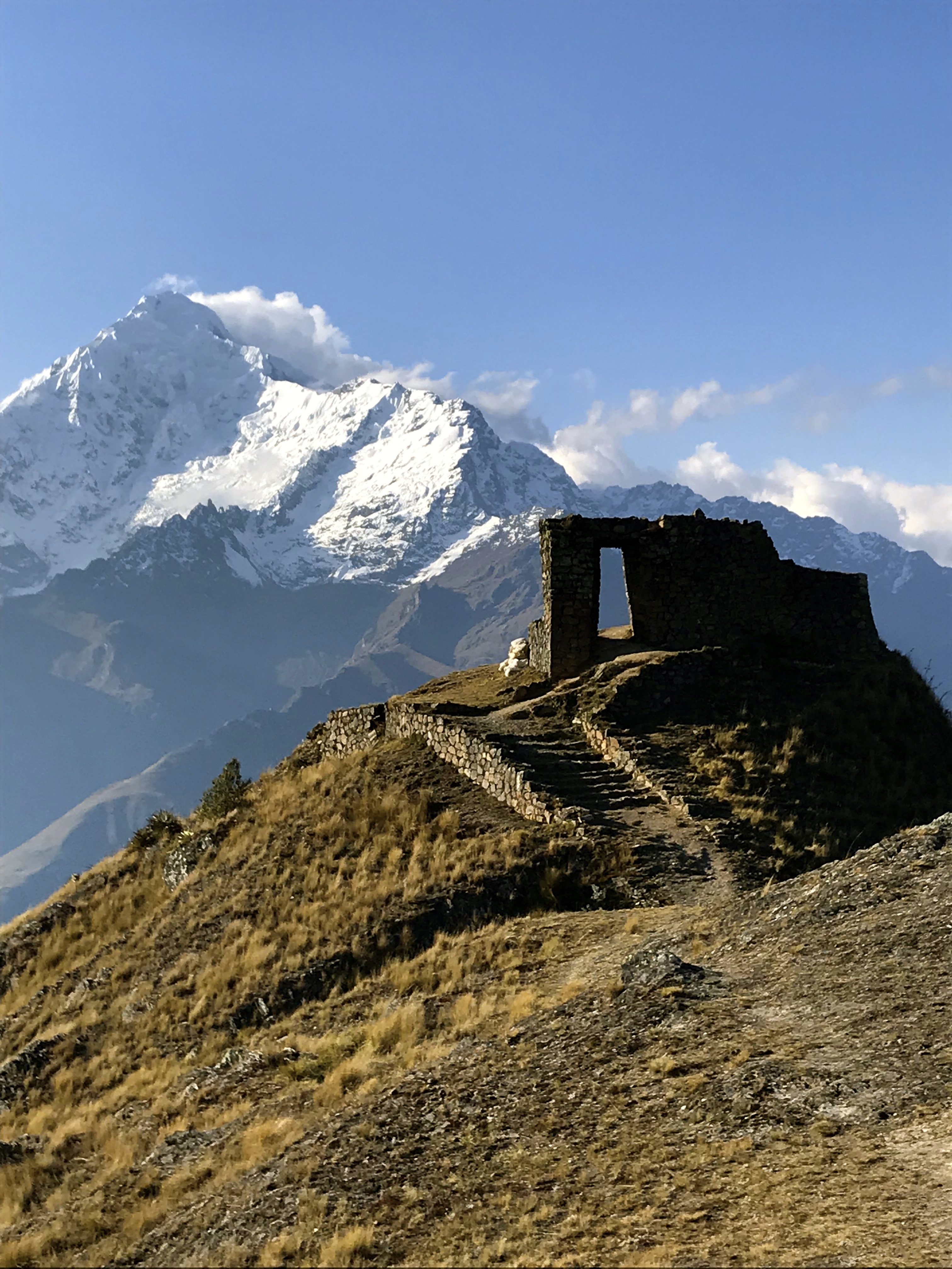 The next morning, I felt a bit stiff but good overall and excited that I would see the sun gate today. I Ate breakfast, loaded up, and headed out. Today’s trek would be challenging with a steep ascent followed by a rocky switchback descent and a gradual slope toward the sun gate. The trails’ uphill accents were very challenging and, at that altitude, was much more complicated than it looked. Once at the top, I was rewarded with an amazing view of the mountains and valley below. Once everyone had reached the top, we had lunch and listened to Hugo talk about the Quechua and Inca people’s traditions and culture. He then explained that the next section would be dangerous, and we would need to use hiking poles to ensure proper stabilization while hiking down the steep boulder and rock-filled switchbacks. Hugo spotted a Condor far up in the sky circling the mountain top as we continued on the hike, and I must say it was quite a majestic experience. As we got toward the bottom, we rested a bit and talked about how technical that section of the hike was and how fortunate we felt to see a Condor flying in the Peruvian Andes.The next section would be to the Sun Gate and take a few hours on mostly even terrain. It is somewhere in this section of the hike that I lost my headphones, which at the time I was frustrated but felt in the end it was a good thing because they can be isolating, and I needed to take in nature’s sounds. As we got about 30 minutes out, you could start to see the sun gate in the distance and the majestic Andes mountain peaks behind it. It felt like something straight out of the Lord of the Rings. My heartbeat was faster as we approached and walked along what seemed like the mountain’s massive backbone.