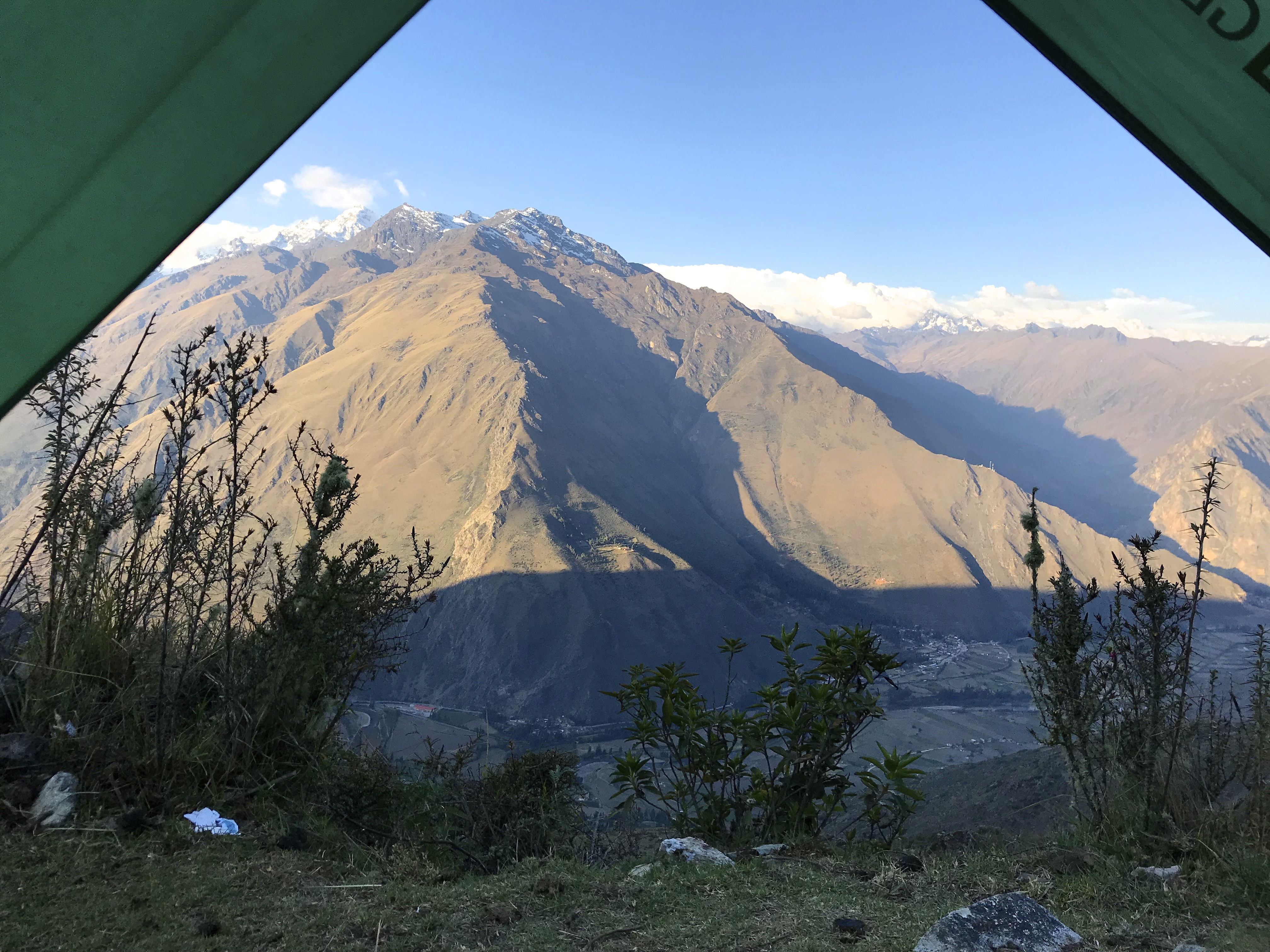 After spending some time at the waterfall cooling off, we continued to hike up the side of the mountain. Eventually, we could see an ancient Inca ruin across the valley on the side of a mountain and above that our first base camp. We continued for another 4 hours or so until we reached the ancient Inca ruins of Q’orimarca, which is believed to have been used for food storage, worship, and a resting point for Inca messengers. From here, you have a fantastic view of the valley and the trail that we had hiked thus far. We rested as Hugo talked about Inca culture and how they would build food storage sites throughout the valley. The Inca knew techniques to preserve foods like potatoes for hundreds of years, how messenger would run different trails to Machu Picchu locations and needed these places for food and shelter. Once Hugo had finished, we continued hiking another 30 minutes until we reached our first base camp. All of the tents had been set up by the porters since we would be arriving so late, and Hugo let us know which tents were who’s and a brief explanation of where to use the restroom, when we would eat, and other basics of camp. I walked over to my tent pretty exhausted and took off my backpack, which felt heavy by that point. It felt so good to unload and relax. I got my sleeping back, and gear situated in my tent and then laid down in front of my tent and did some yoga stretching. As I sat back up and looked out over the valley, the sun began to set. I felt terrific about my strength and endurance and more alive than I had in a long time. I thought about mom and could feel her presence around me and smiled with a tear in my eye as I knew she was enjoying the moment with me.