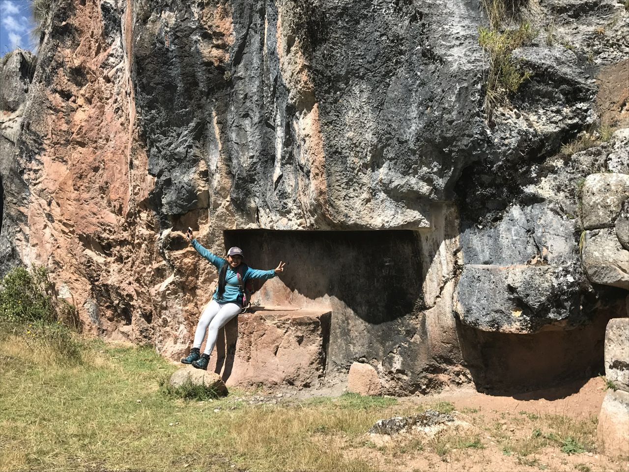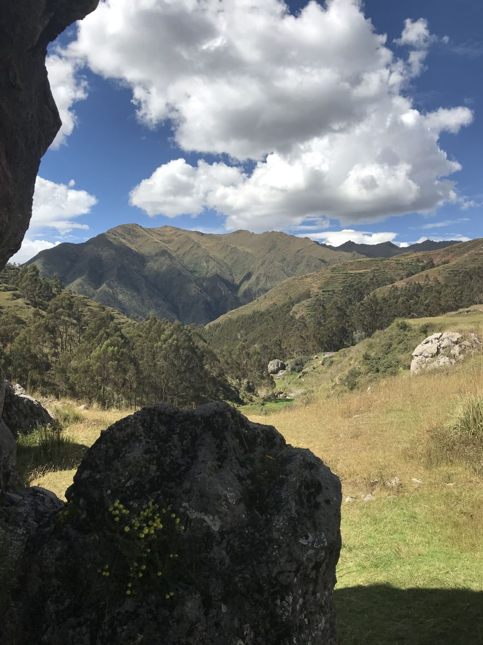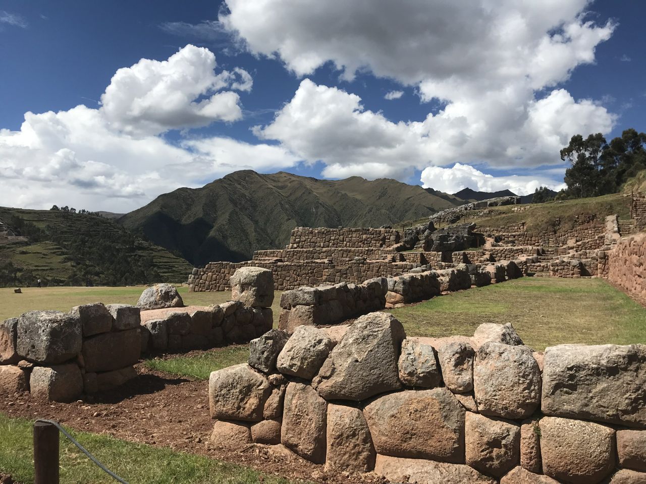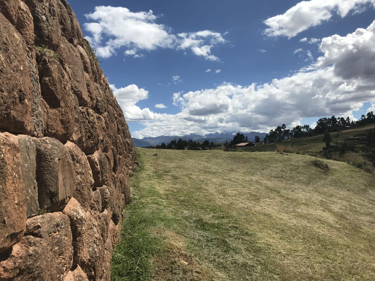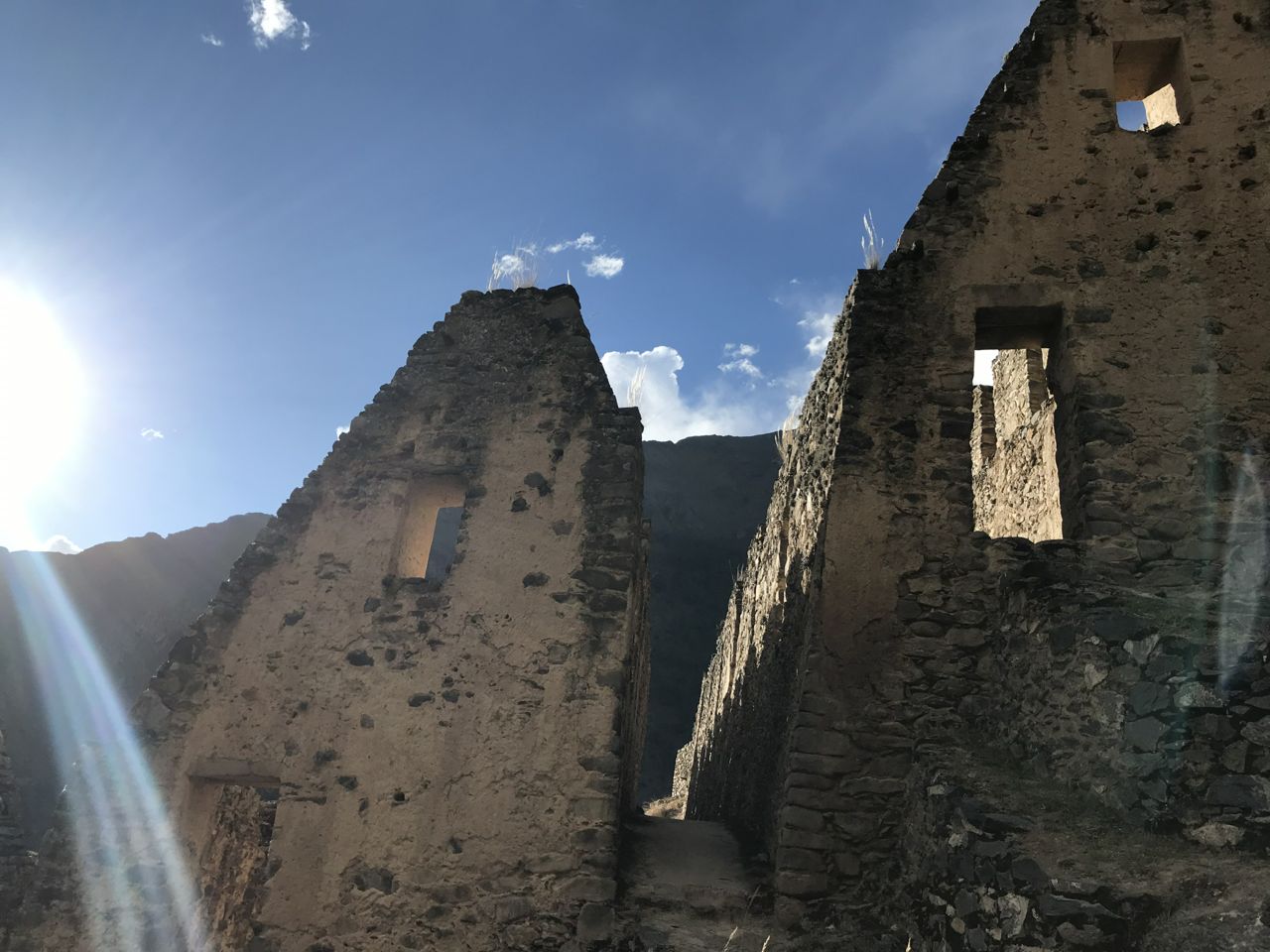 Upon arriving in Chincheros, we saw many Alpaca and a small, close-knit community centered on raising Alpaca and producing goods. Our driver explained he could take us the back way into the nearby ruins on the Urquillos Trek and see from a different perspective. Shirley and I decided to take the hike with our driver being the guide. The ruins were incredible, and the way the rocks were carved almost looked cast into form. At the end of the hike, we came upon a church built on Inca Ruins in the 1600’s “Iglesia Colonial de Chinchero” kinda disrespectful. Still, I must say the church was incredible and felt like something out of Indiana Jones. No photos are allowed inside, and a guard follows you around inside, but the floral and religious paintings throughout are breathtaking. I went up to the altar and said a prayer for mom and grandma with tears in my eyes. I thanked them for the experience. At that moment, feeling so close to my heart as We left the church with Shirley comforting me as we came upon a plaza filled with women selling every variety of alpaca goods in a wide array of colors using mostly natural dies. It is familiar with some products like rugs and bags mixed with wool and are less expensive but need to be aware of or may pay for full Alpaca and get 50% wool. We looked around as our driver/guide. The women of the Andes mountains have been making these goods from Alpaca that go back in the same tradition for hundreds of years. After Shirley covered with the women, we decided to buy a rug and bag made with natural dyes by hand from 100% alpaca for a reasonable price as samples of things we are looking to have made for our business Alpaca Trueke. We headed toward the car and decided to continue to the Sacred Valley and Urubamba. The drive is fantastic, with incredible views of the Andes mountains and valleys. Open arriving in Urubamba, we decided to stop at a local place and drink some Chicha and play Sapo’s game. After enjoying the company of the owner of the establishment and her dog, we continued to Ollantaytambo and the ancient Inca Ruins.