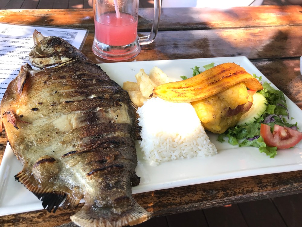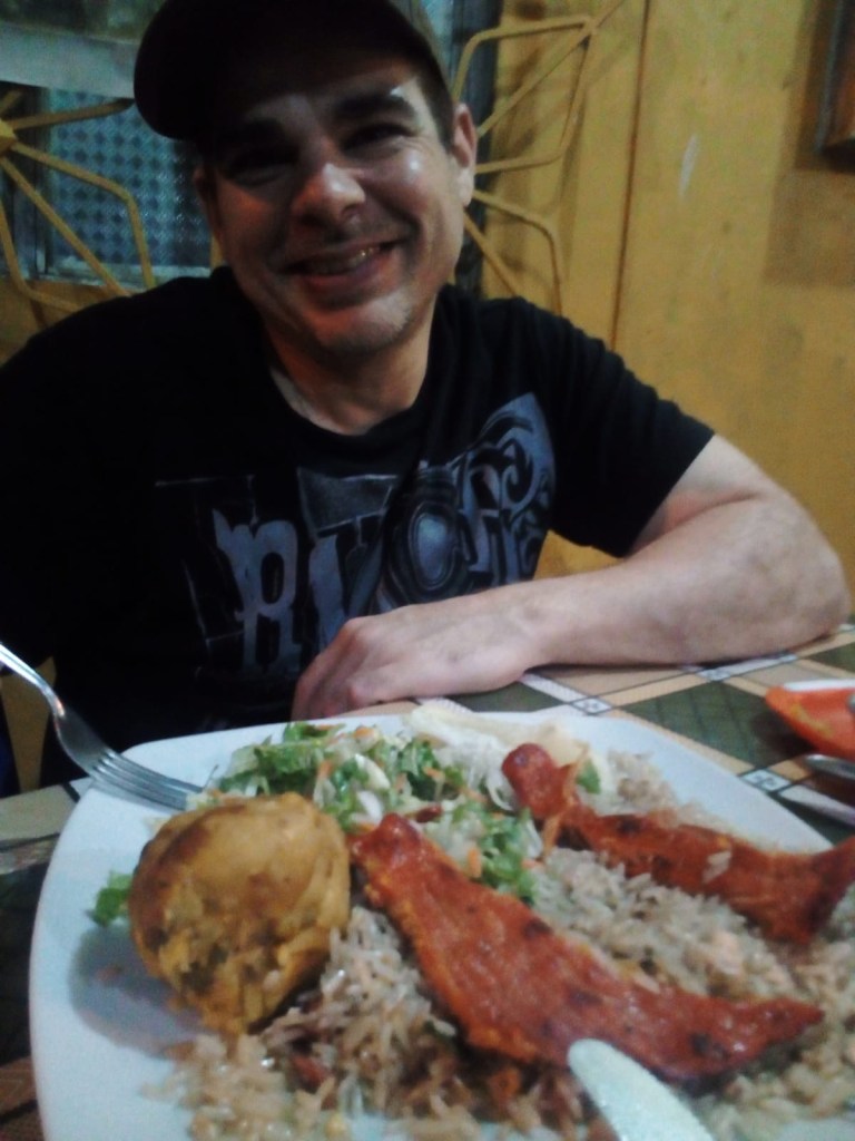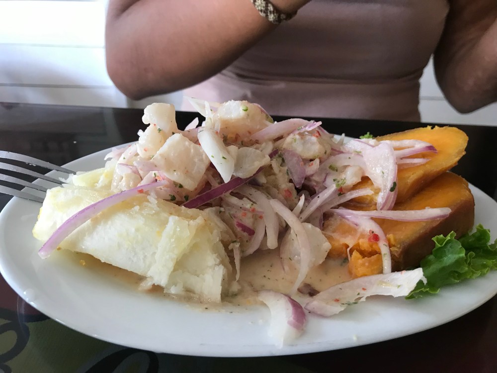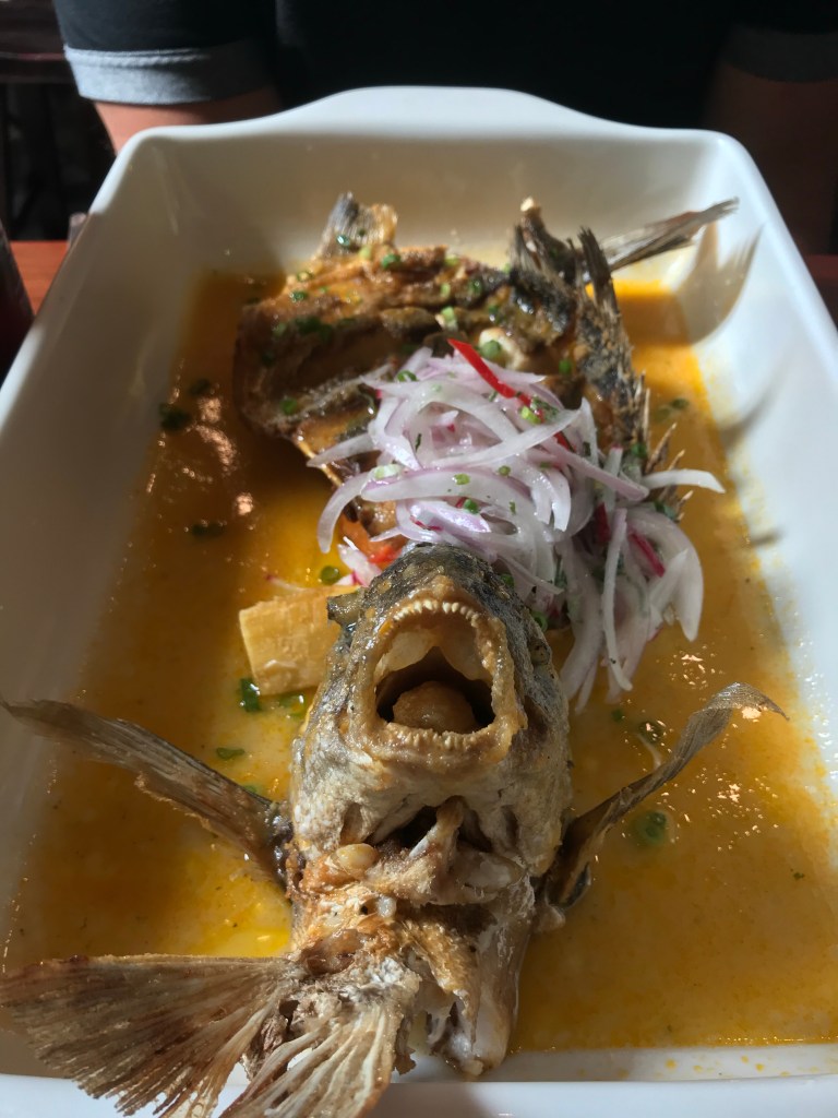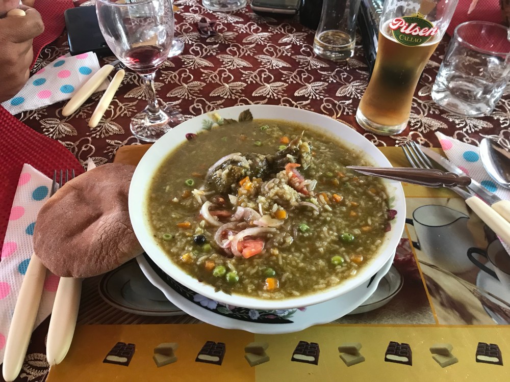 I found that Shirley had a favorite dessert, which is especially popular in Lima Called “Picorones” a pumpkin-based batter similar to the funnel cakes you get at fairs in The United States but made in the shape of thin donuts and dressed with a syrup made from sugar cane. The cane juice is boiled for a long time until it becomes molasses and made into balls called “Chancaca” they cook that ball with orange peel, cinnamon, clove, fig leaves, and that becomes the syrup for the picarones. But other people make it by boiling water with sugar, cinnamon, cloves, or orange peel, and it is unique and compliments the picarones perfectly. During our time in Lima Shirley had a delicious meal called “Arroz con Pato” (rice with duck) which is green rice with liquefied coriander, carrots, peas, and duck breast. It also has black beer and a creole onion salad with parsley and sweet chili. Like with all meals in Peru, delicious and hearty. Another dish we had while waiting for our laundry to be cleaned while staying in Lima was at a lovely restaurant serving fresh fish of all kinds on display. We had A dish called “Sudado” in which they take the entire fish and fry half, make soup from half, and sauté the whole fish dressed with sauce, onions, and peppers. The main dish may look scary but is very flavorful and fresh.