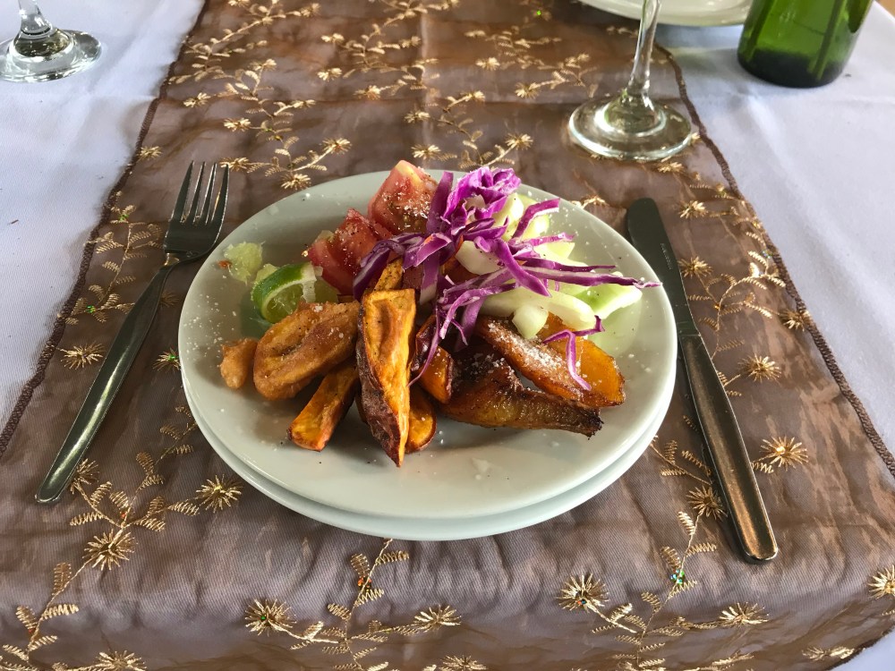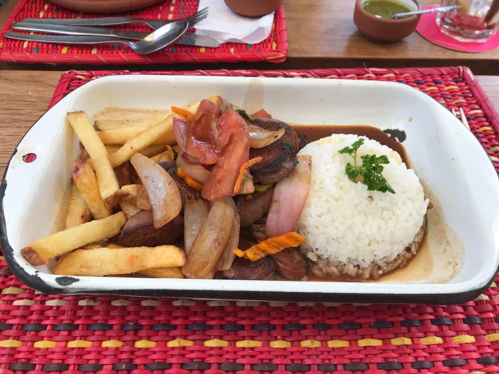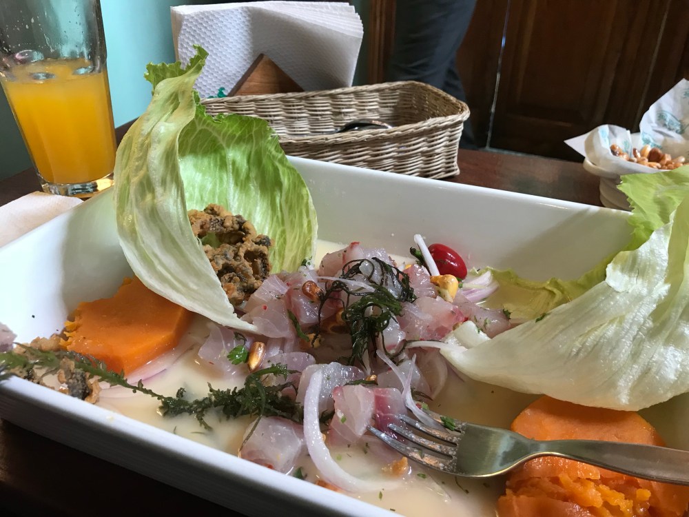 Shirley and her mom make another great dish called Tallarín de casa con estofado de gallina, a Chicken stew with homemade spaghetti, carrots, peas, and tomato. This dish reminds me a little bit of Italian food and is one of my favorites. Another dish that I grew fond of and Shirley and I often ate at a small family-owned place was Pollo canga. This is a Grilled chicken dish with rice, yucca, and roasted banana ball. It is prevalent in Peru to have multiple carbohydrates and starches in one dish, so if you are into the whole Keto thing, you will be in trouble. This dish’s variation is Tacacho con cecina, which is a roasted banana ball with dried (smoked) pig meat. I enjoyed a great salad called Ensalada mixta, which consisted of purple cabbage, fried ripe banana, fried sweet potato, cucumber, and tomato in a lemon vinaigrette.