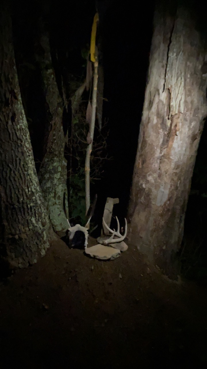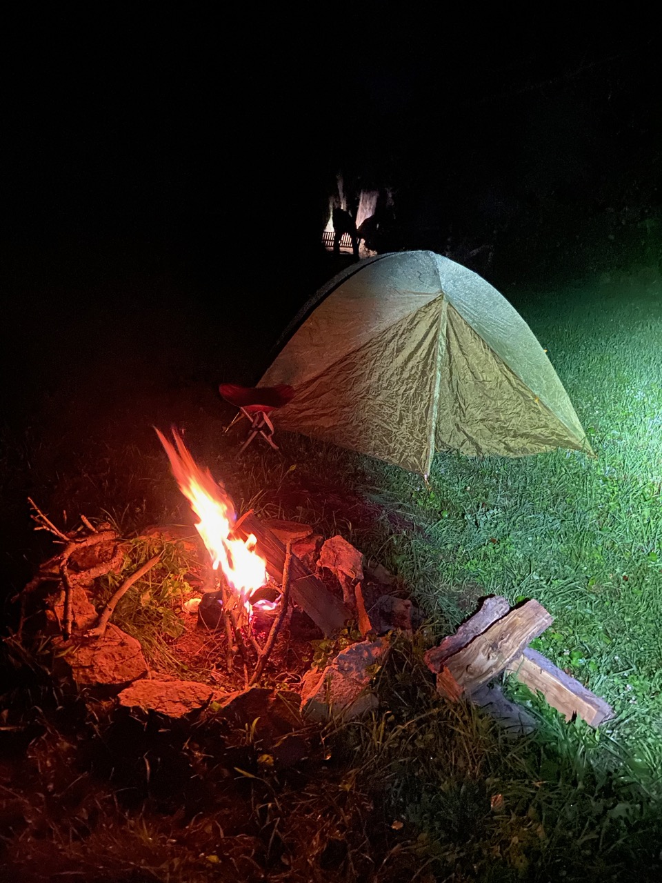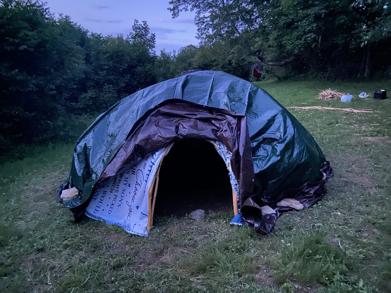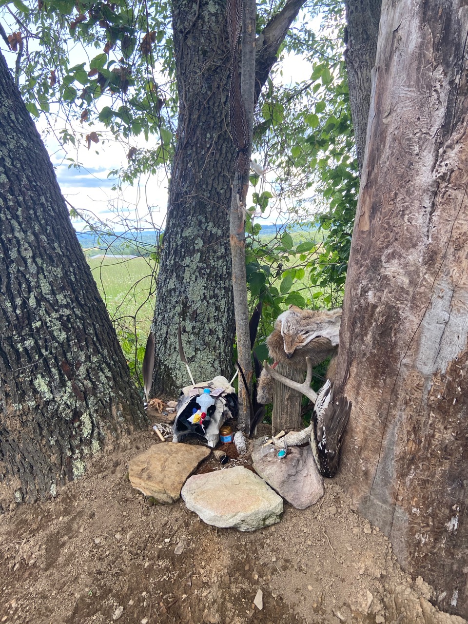 We wanted to have a ceremony that night to test out the Inipi, so we rushed to get things done because we knew time was of the essence. It took many blankets, quilts, and rugs to cover the Inipi, including a quilt my mom had given me as a kid and two 14′ x 14′ tarps. We started gathering the wood for the fire to heat the rocks (including the shavings from the saplings), getting water for drinking and water for the rocks to create steam. I would participate as the fire tender, so I built the wood stack around the stones to ensure the most effective heat transfer. I started the fire at dusk and continued to heat them for three hours until the rocks were glowing orange. Chad prepared everything to facilitate the ceremony, including chalupa, drum, water, prayer ties, sage, and other items associated with the ceremony.