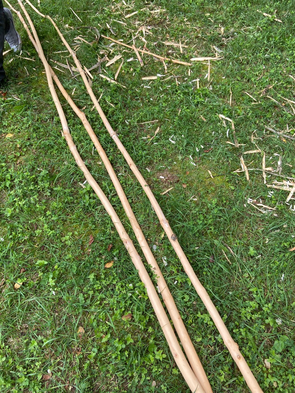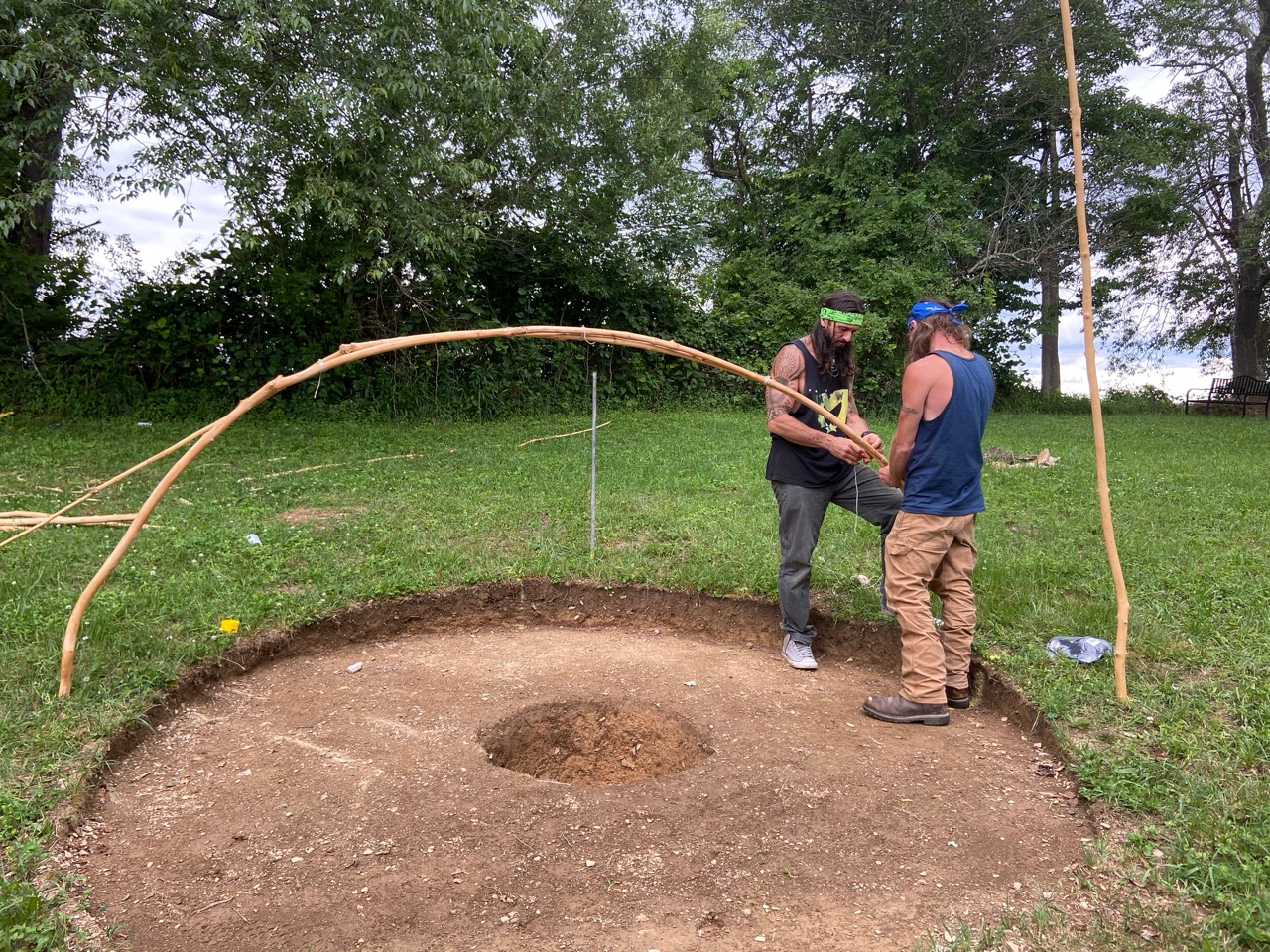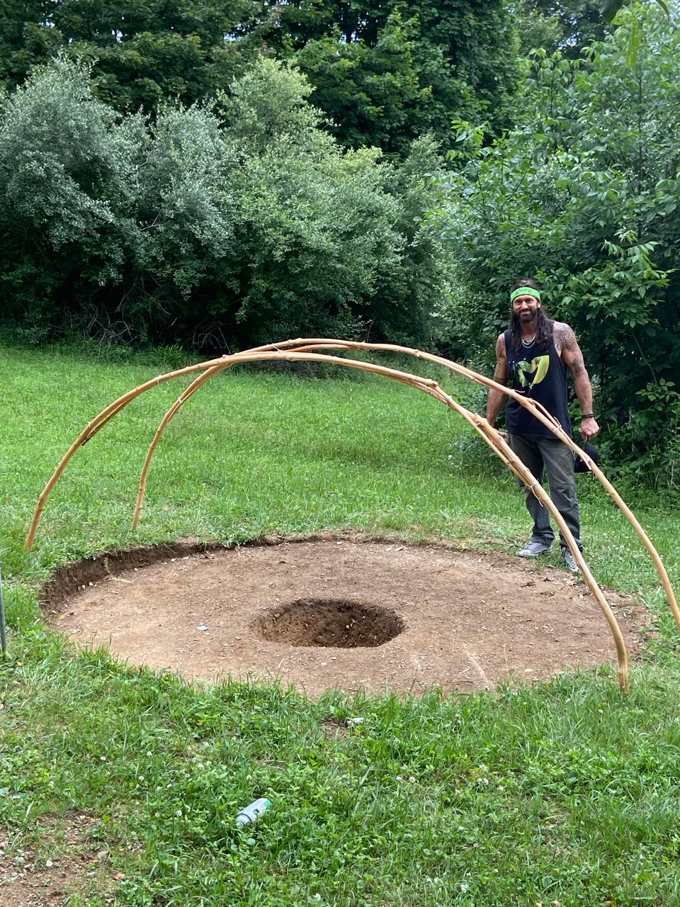 Arriving at Chad’s on Friday, we began to work on the Inipi, which was a new process, but we felt guided directly by intuition. Chad had already harvested the White Ash saplings from his property which we would later discover was a sacred tree to Native Americans and drove out snakes and evil spirits. Chad had also already dug out the circle and pit for the stones making sure to exit clockwise as he removed the earth. The dirt harvested from creating the circle and pit was used to build the base for the totem. Everything used in the building of the Inipi had been smudged with sage and respected in Native American tradition. We began by measuring and driving holes into the ground where we would place the saplings. First, we started with the four winds: North, South, East, and West, then the four corners totaling eight. We then started striping all of the saplings of the bark and smoothing the surfaces. The process was very time-consuming but felt very natural, and I enjoyed the process.