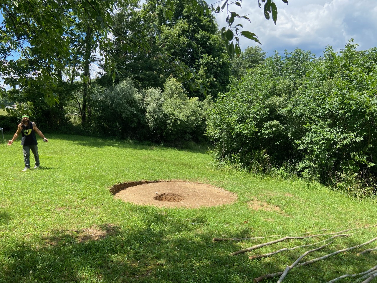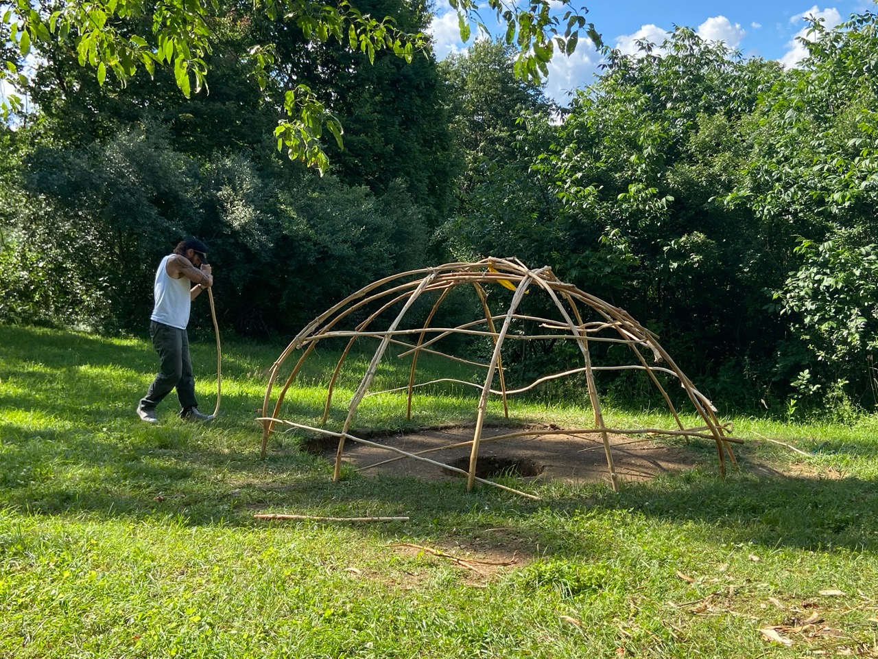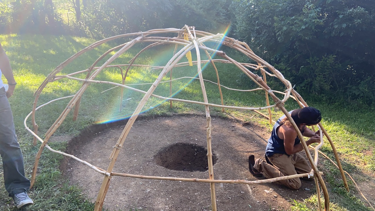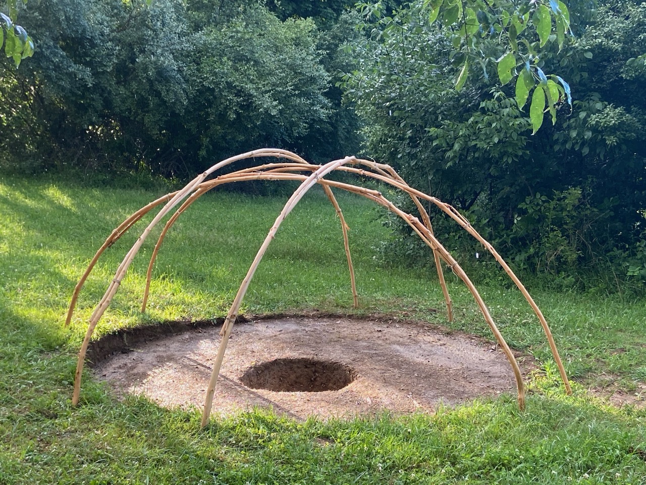Arriving at Chad’s on Friday, we began to work on the Inipi, which was a new process, but we felt guided directly by intuition. Chad had already harvested the White Ash saplings from his property which we would later discover was a sacred tree to Native Americans and drove out snakes and evil spirits. Chad had also already dug out the circle and pit for the stones making sure to exit clockwise as he removed the earth. The dirt harvested from creating the circle and pit was used to build the base for the totem. Everything used in the building of the Inipi had been smudged with sage and respected in Native American tradition. We began by measuring and driving holes into the ground where we would place the saplings. First, we started with the four winds: North, South, East, and West, then the four corners totaling eight. We then started striping all of the saplings of the bark and smoothing the surfaces. The process was very time-consuming but felt very natural, and I enjoyed the process.