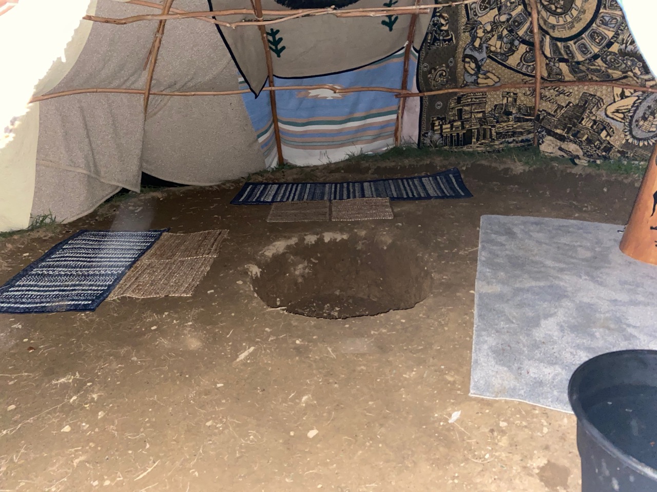 Once the rocks were ready, Chad and Adam entered the Inipi. I started transferring the stones into the Inipi, circling clockwise and doing my best to follow the native traditions. Still, I accidentally moved some coals from the fire that caused smoke inside the Inipi. Once I had transferred all of the stones, I entered the Inipi, and we closed it up, making sure no light could enter. We settled in, and Chad started the ceremony by playing drum beats and pouring water onto the rocks to orchestrate the ceremony. We were surprised by how hot we were able to get the Inipi, considering we did not have the ideal type of stones and the large size of the Inipi. We did four rounds of about twenty minutes each, taking a break between passing a wooden ladle of water, the chalupa, and giving thanks Mitákuye Oyás’iŋ.