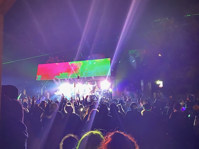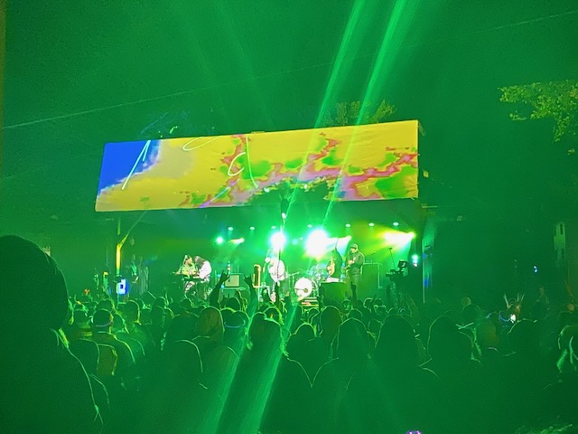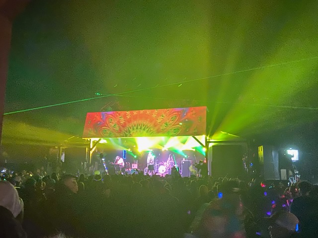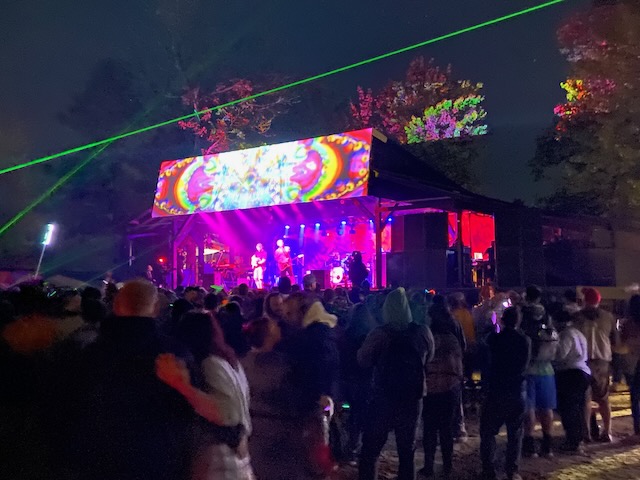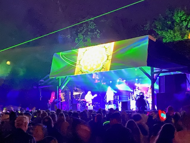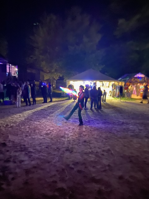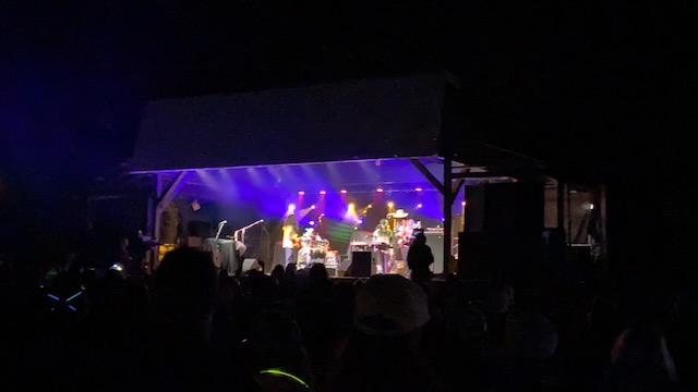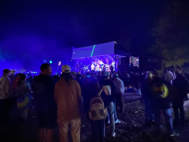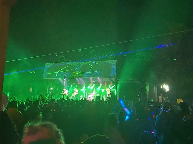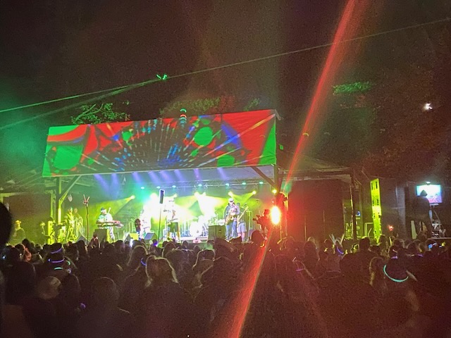 The first evening I looked forward to hearing Fayuca https://www.fayuca-music.com a Latin American Reggae band from Phoenix, Arizona and Badfish https://www.badfish.com a Sublime tribute band from Rhode Island. We relaxed at the campsite and talked for awhile until we heard the music start playing. W then walked up through shakedown toward the stage which was now alive with energy and people dancing. We went to the table were our friends had been sitting and listened to the music for awhile. Fayuca put on a good performance but the music seemed a little repetitive and I discovered the horns saved it. After Fayuca played I explored for awhile and by that time the woods had become a glowing techno extravaganza full of lights and bass that hit every sense with a punch. We continued deeper into the woods as the lights and music got more intense with people dancing and partying. We walked around for awhile longer following the path lit by thousands of glow sticks, seeing people we knew and visiting different campsites until we circled around the lake and returned to the concert by which time Badfish was getting ready to play.