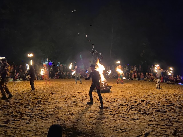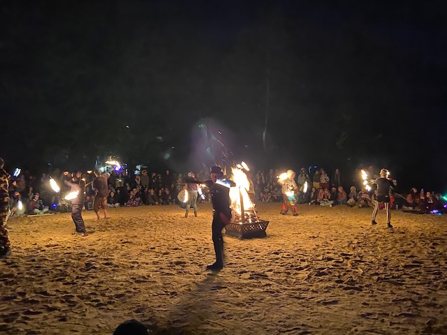 After the music ended we walked to the beach where all of the fire and glow stick jugglers had gathered to put on a performance. The skill and precision that the fire jugglers perform is mesmorizing and everyone was in awww of the show they were putting on. We watched as they performed to the beat of the music and relaxed in the sand until we decided to make our way back out onto the natural peer. From the peer we could see from a distance the fire jugglers and slightly hear the music in the background. I looked up at the stars, thanked god for the opportunity to enjoy such an amazing event. We were the only ones on the natural peer and it was a very peaceful moment. We left the peer and headed into the woods for one last time to enjoy the spectacle before heading back to the RV to get some sleep.