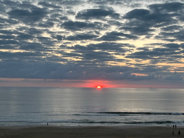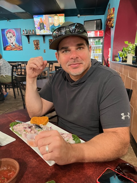 The next morning Shirley got me up for the sunrise and we enjoyed listening to the ocean while watching the sun peak out above the ocean. We then headed out to the beach as we were one of the first people on the beach we got a great spot. The beaches did not get crowded and we enjoyed swimming in the ocean, jumping waves, body surfing and collecting shell using the snorkel gear Shirley had got me for my birthday. We spotted many groups of dolphins swimming in the ocean back and forth eating fish for most of the day, After relaxing a bit more, absorbing the suns rays, and letting the ocean sounds calm our minds we decided to search for ceviche. After some research we decided to goto the Side Street Cantina which was close to our hotel and had pretty good reviews. It seemed like a Mexican restaurant but had Peruvian ceviche listed on the menu. We entered the restaurant and were seated, the restaurant had nice decor and bright latin inspired paintings on the walls. We ordered a few margaritas and both got the Peruvian ceviche which was made with sashimi style Tilapia which is not typical in Peru. The ceviche arrived and tasted ok, it did have the traditional red onion, hot peppers, and sweet potato you find in Peru. We enjoyed listening to the latin music while drinking margaritas and eating ceviche. After leaving the Side Street Cantina we walked up and down the entire boardwalk and checked out the peer. We walked back to the hotel to rest for a bit before getting ready for dinner.